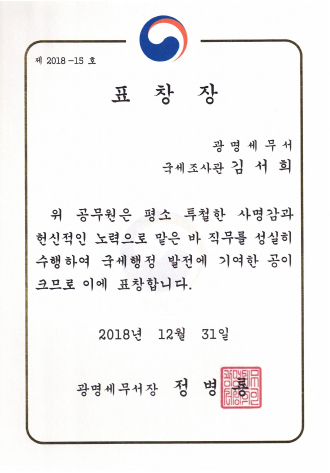 광명세무서장표창