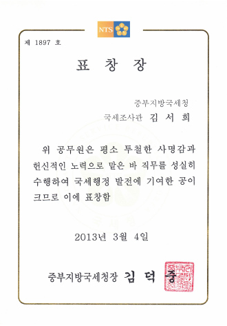 중부지방국세청장표창